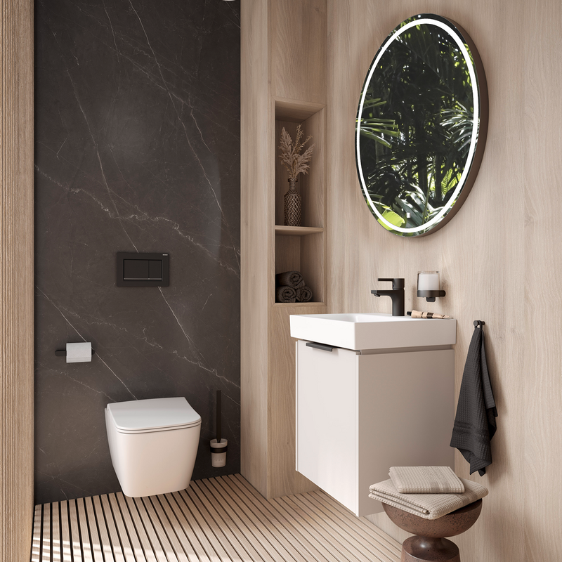 - Das kompakte Waschbecken mit einer Breite von 50 bis 60 cm samt Unterschrank nutzt die Wandfläche effizient und bietet praktischen Stauraum.