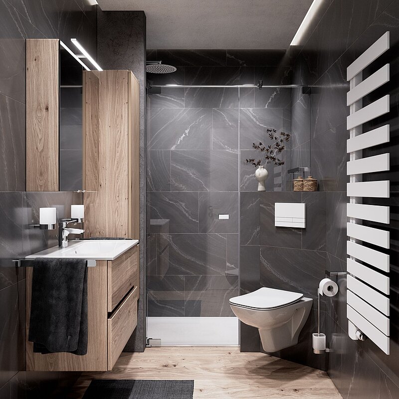 Beim Heizen gibt es ebenfalls platzsparende Lösungen: Ein Handtuchheizkörper ist schmaler als ein klassischer Heizkörper und erfüllt gleichzeitig zwei Funktionen – er wärmt den Raum und dient als Handtuchhalter.
