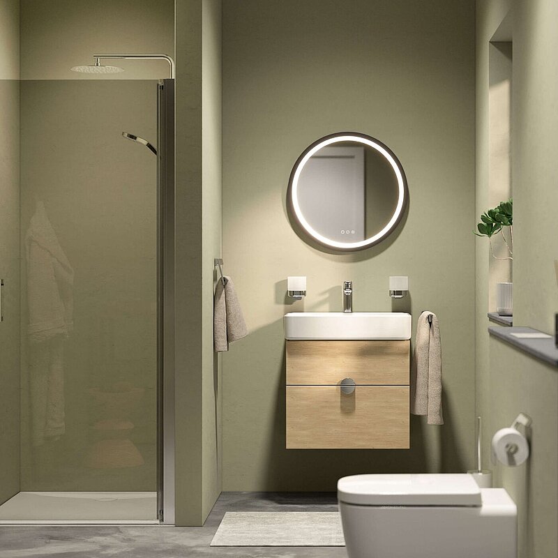 Wenn die Logik des Grundrisses steht, können die Verstärker wirken. Licht schafft Überblick und Atmosphäre – gleichmäßige Grundbeleuchtung zuerst, Akzente nur ergänzend. Farben und Fliesen geben Ruhe durch Wiederholung: große Formate, klare Linien, wenige Fugen. Spiegel verdoppeln, was ihnen gegenüber liegt – darum sollten sie wenn möglich nicht das WC zurückwerfen, sondern die Dusche, ruhige Flächen oder Licht. Mehr Tipps und Ideen rund um Farben, Formen und Materialien finden Sie in unserem Beitrag Kleines Bad gestalten.