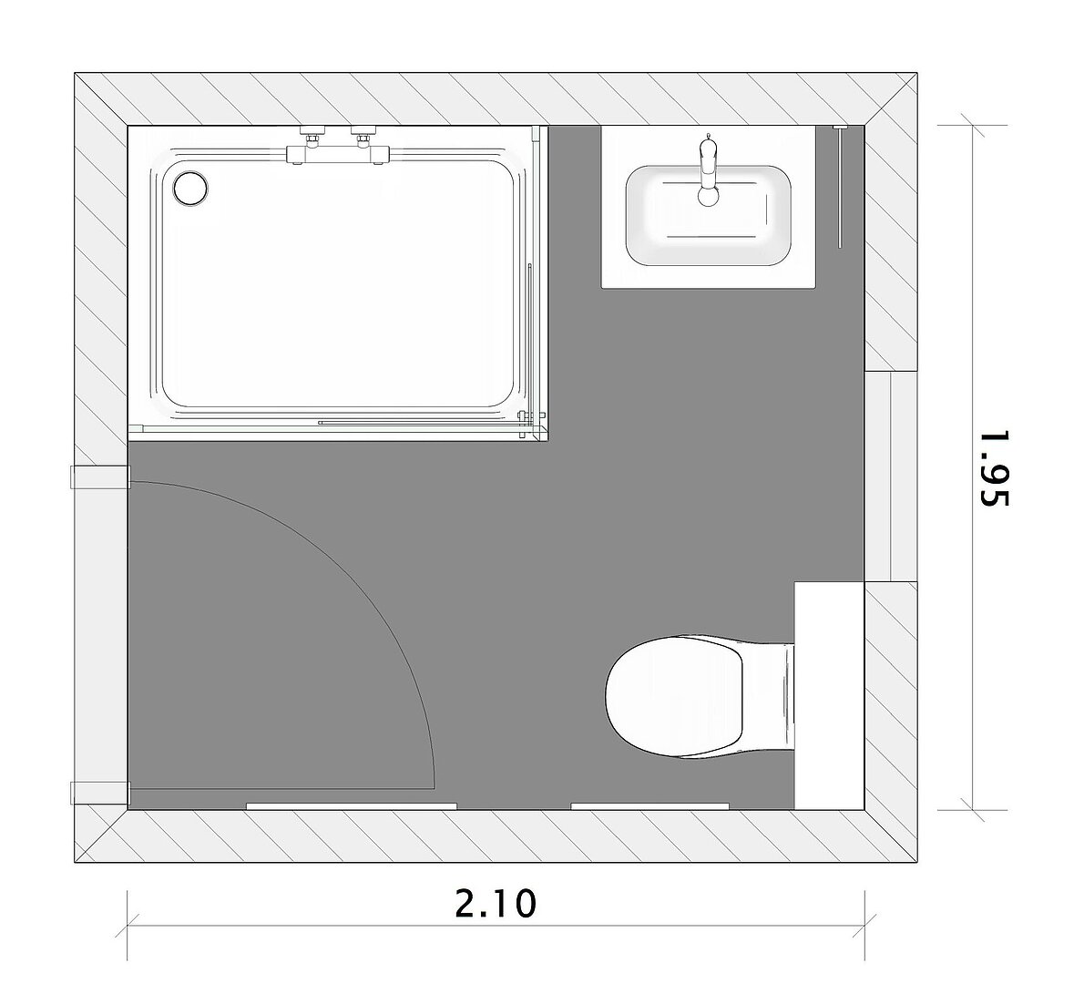 Bei zwei Quadratmetern überlagern sich nahezu alle Bewegungsflächen. Dusche, WC und Waschplatz teilen denselben Vorbereich. Türanschlag und Zugänglichkeit werden zum zentralen Planungsfaktor. Stauraum ist nur noch minimal oder ausschließlich in die Höhe verlegt möglich.
