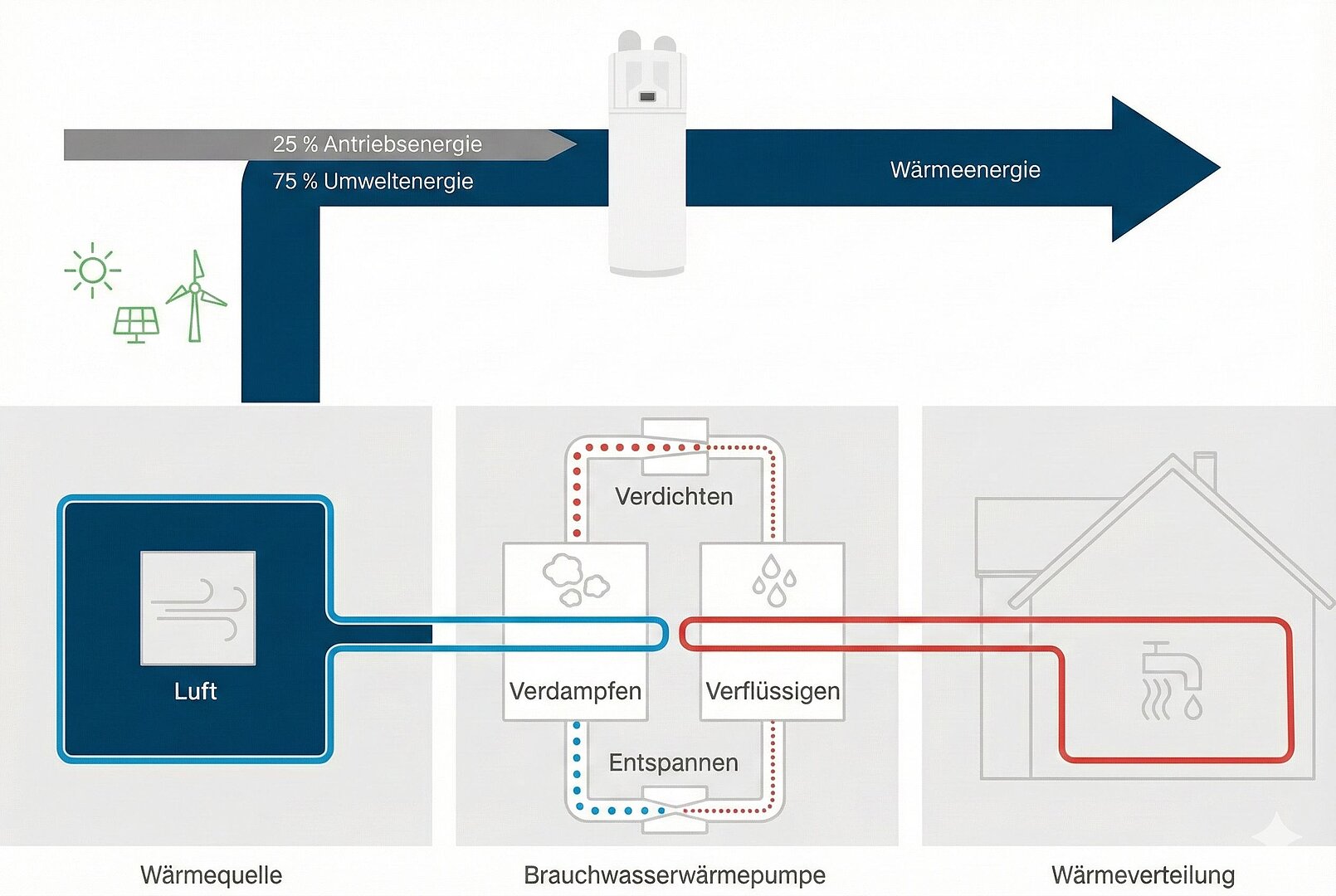 Das Funktionsprinzip entspricht dem anderer Wärmepumpenarten – mit einem entscheidenden Unterschied: Eine Warmwasser-Lösung mit Wärmepumpe ist ausschließlich für die Trinkwasserbereitung zuständig und ersetzt nicht das Heizsystem, lässt sich jedoch ideal in bestehende Heizkonzepte integrieren.